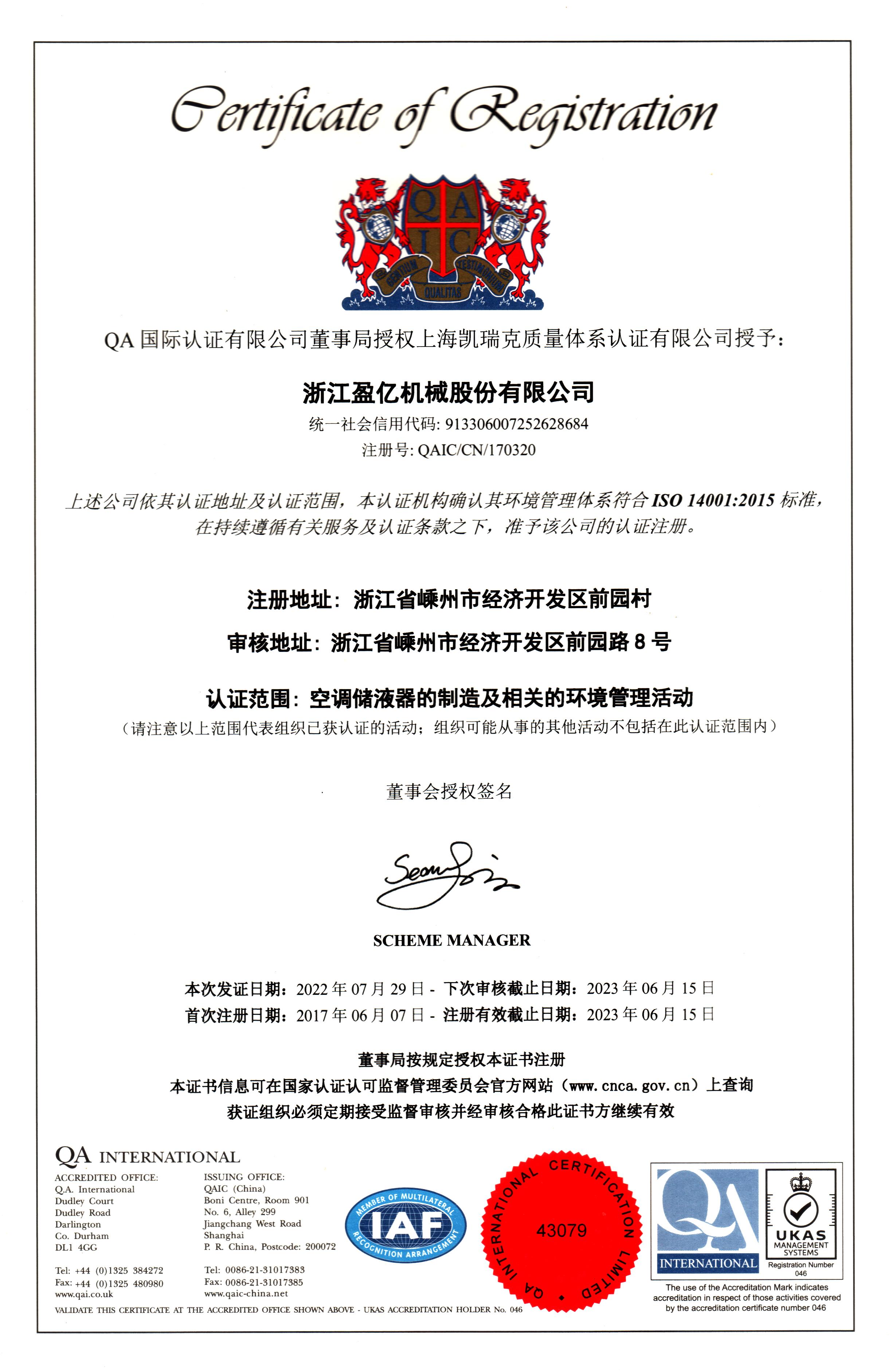 環境管理體系認證證書